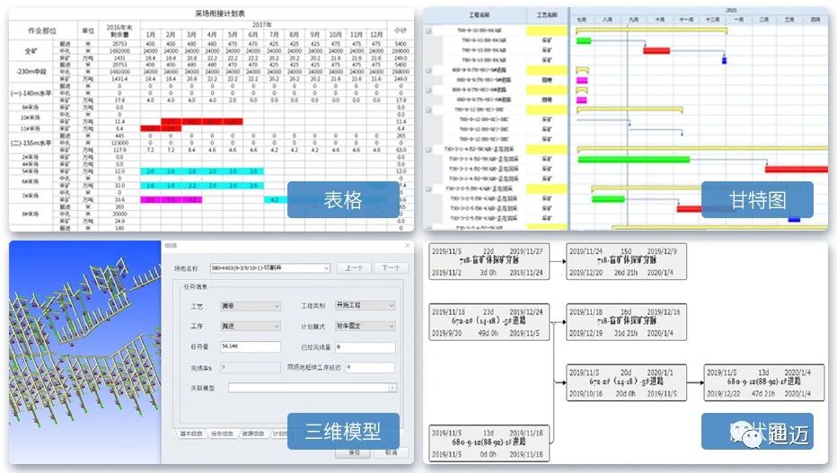 2、研發(fā)“三維模型-甘特圖-網(wǎng)絡(luò)圖-數(shù)據(jù)表”四位聯(lián)動(dòng)的地下礦采掘計(jì)劃編制系統(tǒng),實(shí)現(xiàn)排產(chǎn)參數(shù)批處理、計(jì)劃聯(lián)動(dòng)編制和分期采掘圖、自定義報(bào)表、進(jìn)度動(dòng)畫(huà)及三維模型等多種計(jì)劃成果展現(xiàn)驗(yàn)證形式。